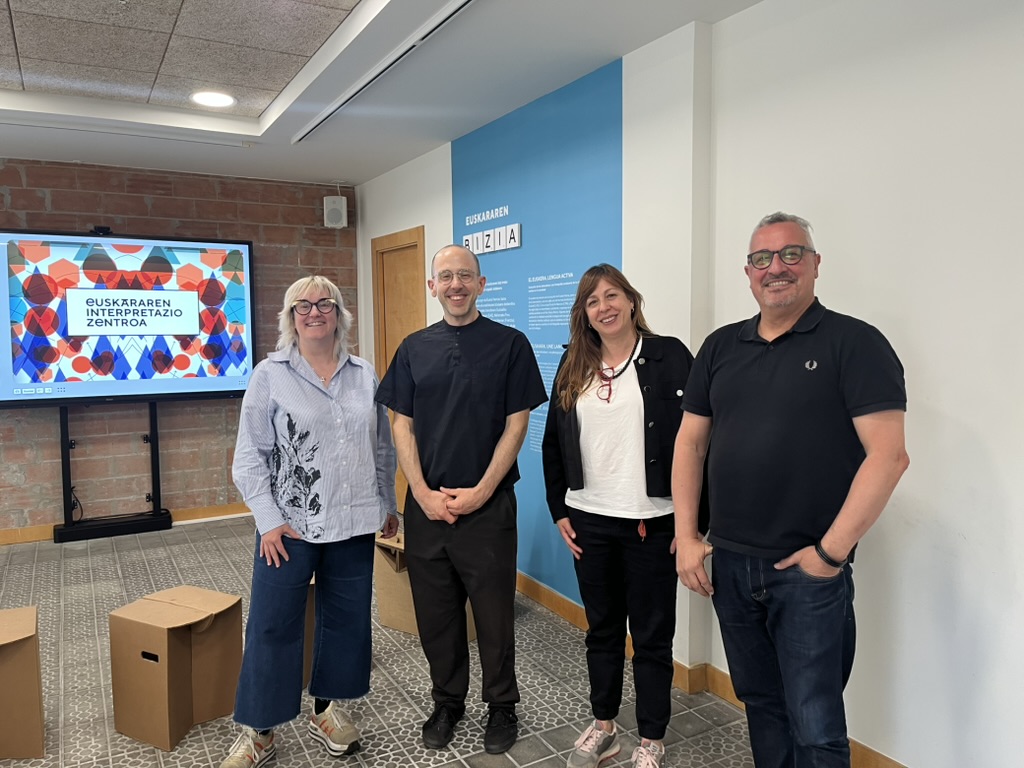 Ezkerretik eskuinera: Iurdana Acasuso Euskararen Etxeko zuzendaria, Aingeru Aroz hizkuntzalaria, Eva Tuneu Euskararen Interpretazio Zentroko erakusketaren komisarioa eta Julen Azpitarte Euskararen Etxeko komunikazio arduraduna.